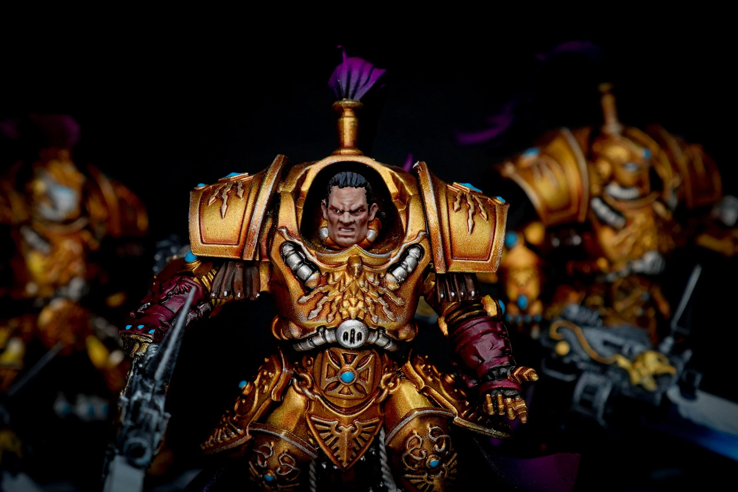 Allarus Pattern Terminator Armour is the pattern of Tactical Dreadnought Armour currently used in the 41st Millennium by the Allarus Custodians of the Adeptus Custodes, the praetorian guard of the Emperor of Mankind. The Allarus Pattern is an expertly crafted form of Terminator Armour whose worth can be measured in worlds. Driven by magnatomic generator-shrines, articulated with Leonus-class actuators, and fashioned from layered auramite and adamantium, Allarus Terminator Armour is a marvel of craftsmanship.
